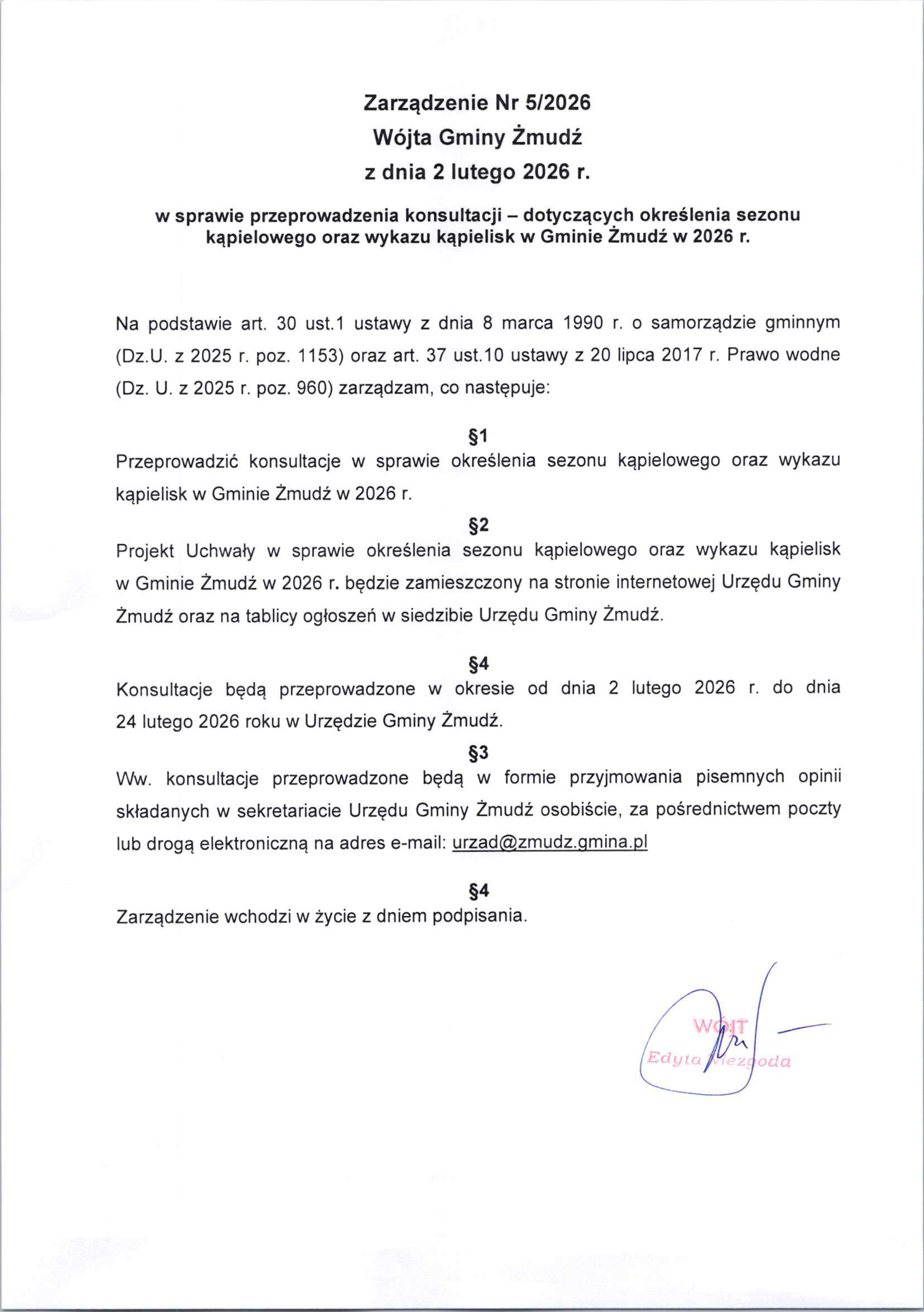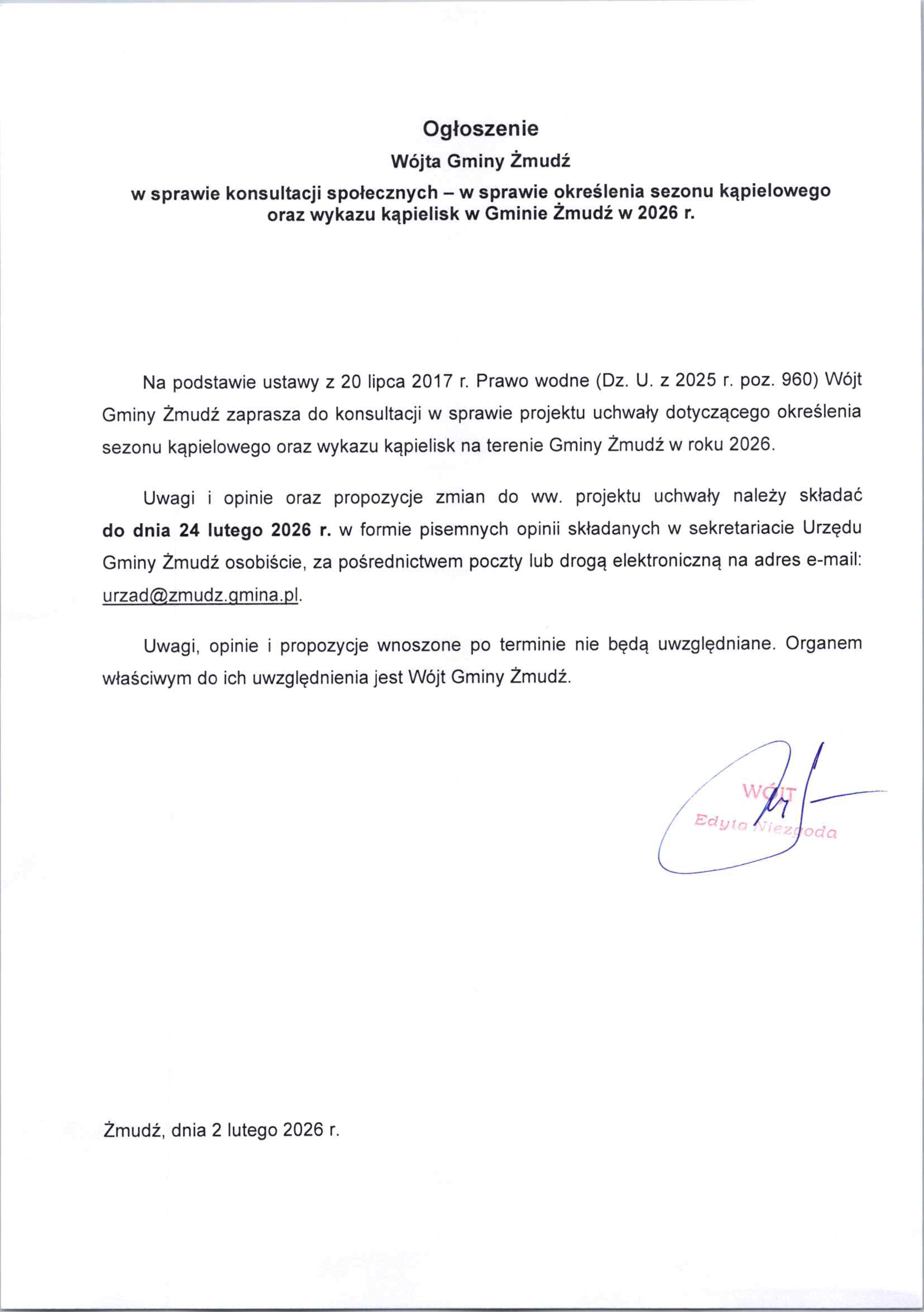 Ogłoszenie Wójta Gminy Żmudź w sprawie konsultacji społecznych - w sprawie określenia sezonu kąpieliskowego oraz wykazu kąpielisk w Gminie Żmudź w 2026r.