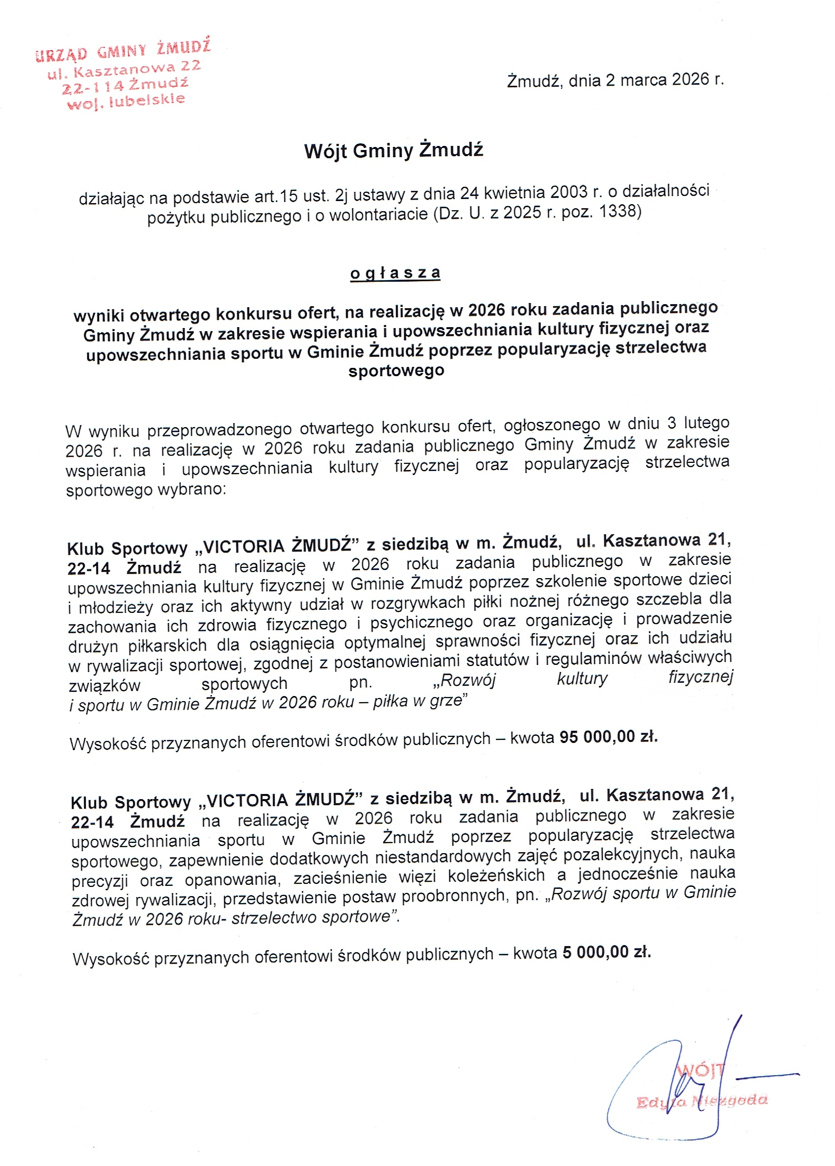 powrót do listy przetargówWójt Gminy Żmudź Ogłasza otwarty konkurs ofert na realizację w 2026 roku zadania publicznego Gminy Żmudź w zakresie wspierania i upowszechniania kultury fizycznej oraz popularyzację strzelectwa sportowego zaprasza do składania ofert